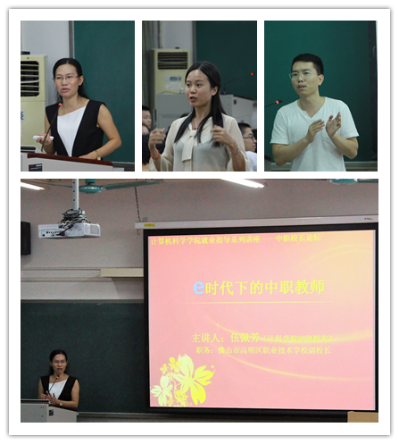 10月12日晚,在二教403课室举行中职校长论坛。本次讲座的主题为“E时代下的中职教师”,主讲嘉宾是来自佛山市高明区职业技术学校的副校长同时也是98级校友伍佩芳和13级校友蔡钰莹。讲座由学院团总支书记曾祥书主持。
