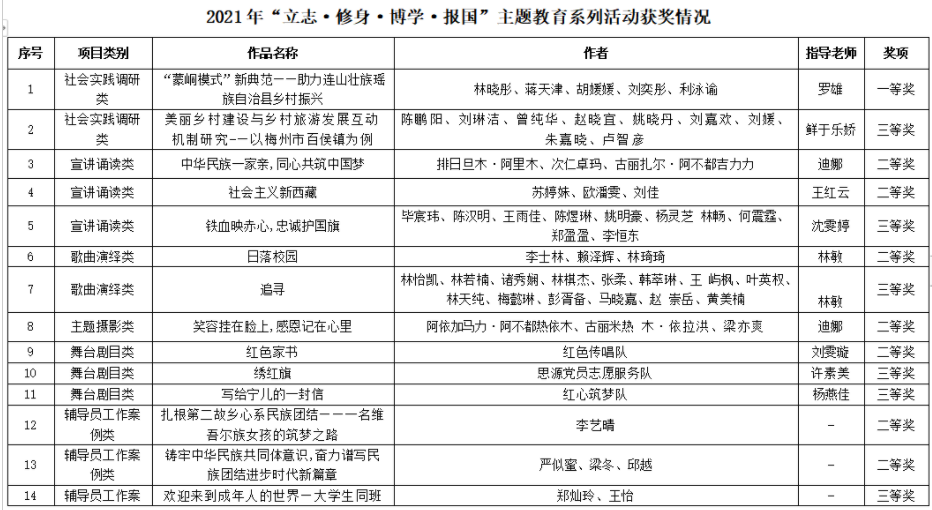 其中,迪娜老师指导学生排日旦木·阿里木、次仁卓玛、古丽扎尔·阿不都吉力力的项目《中华民族一家亲,同心共筑中国梦》获宣讲朗诵类二等奖;迪娜老师指导学生阿依加玛力·阿不都热依木、古丽米热木·依拉洪、梁奕爽的项目《笑容挂脸上,感恩记心里》获主题摄影类二等奖;李艺晴老师的工作案例《扎根第二故乡心系民族团结——一名维吾尔族少女的筑梦之路》获辅导员工作案例类二等奖。