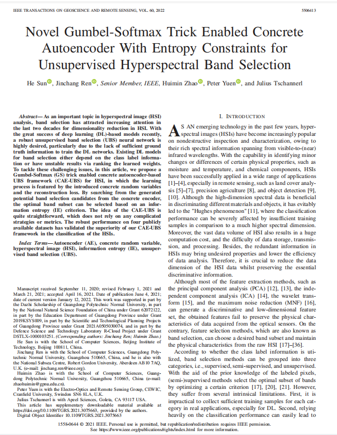 【4】He Sun, Jinchang Ren*, Huimin Zhao*, Peter Yuen, Julius Tschannerl,“Novel gumbel-softmax trick enabled concrete autoencoder with entropy constraints for unsupervised hyperspectral band selection”,IEEE Trans. Geoscience and Remote Sensing, 60(1-13), 2022. ( Top,SCI二区,影响因子7.72)