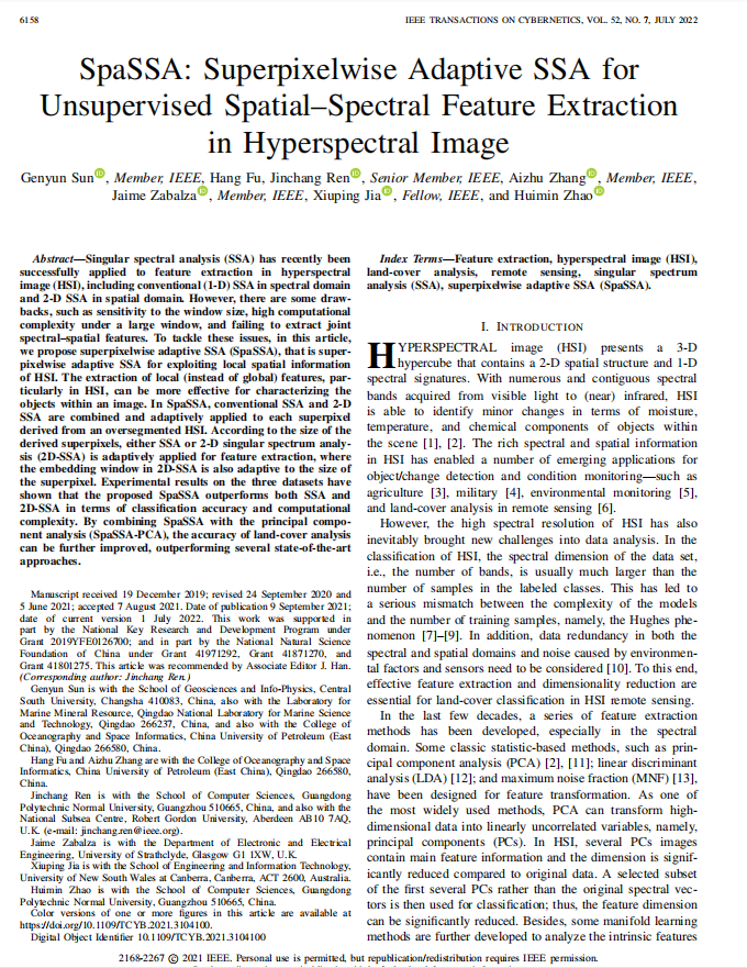 【3】G Sun, H Fu, J Ren*, A Zhang, J Zabalza, X Jia, H Zhao, “SpaSSA: Superpixelwise adaptive SSA for unsupervised spatial-spectral feature extraction in hyperspectral image”, IEEE Transactions on Cybernetics, 52(7): 6158-6169, 2022.(影响因子为11.448,SCI一区.TOP期刊)