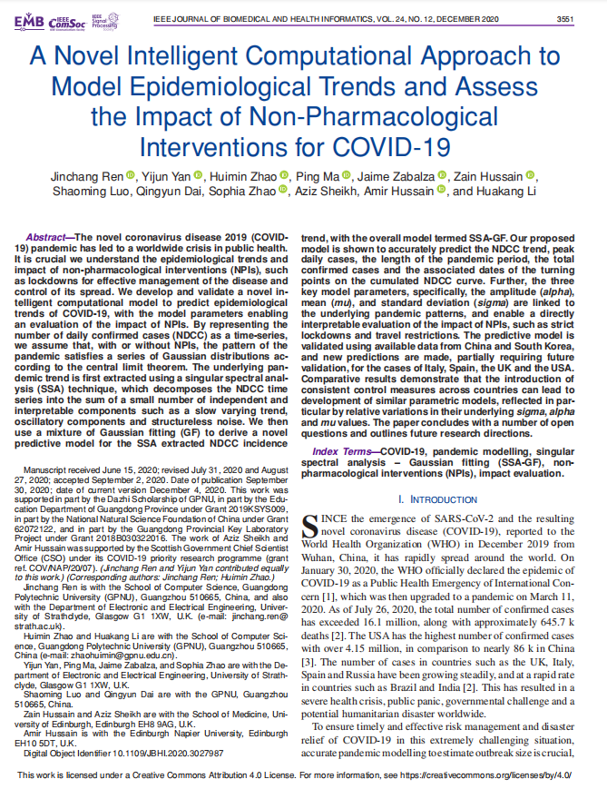 【2】J.CRen∗, Yan Y, H.MZhao*, Ma P, J.Zabalza, Z. Hussain,H.K. Li. A novel intelligent computational approach to model epidemiological trends and assess the impact of nonpharmacolo-gical interventions for COVID-19 [J]. IEEE journal of biomedical and health informatics,IEEE journal of biomedical and health informatics,24(12):3551-3563,2020.(Top,SCI一区,CS=10.9)