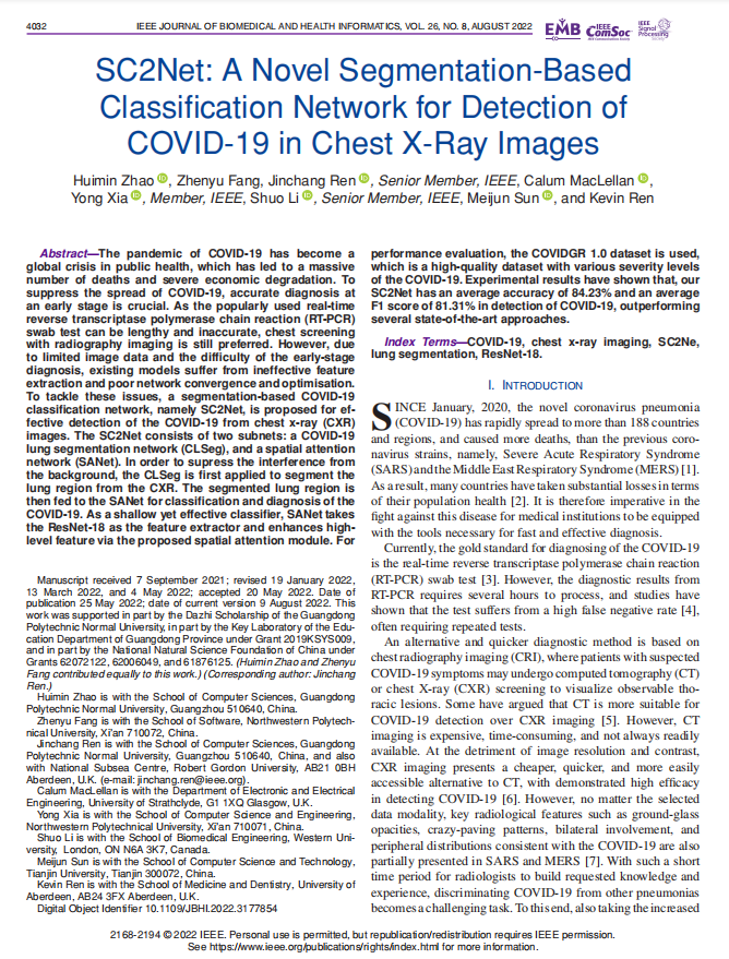 【1】Huimin Zhao∗, Zhenyu Fang∗, Jinchang Ren, Calum Maclellam,et al.SC2Net: a novel segmentation-based classification network for detection of Covid-19 in chest X-ray images, IEEE Journal of Biomedical and Health Informatics, 26(8): 4032-4043, 2022.(Top,SCI一区,CS=10.9)