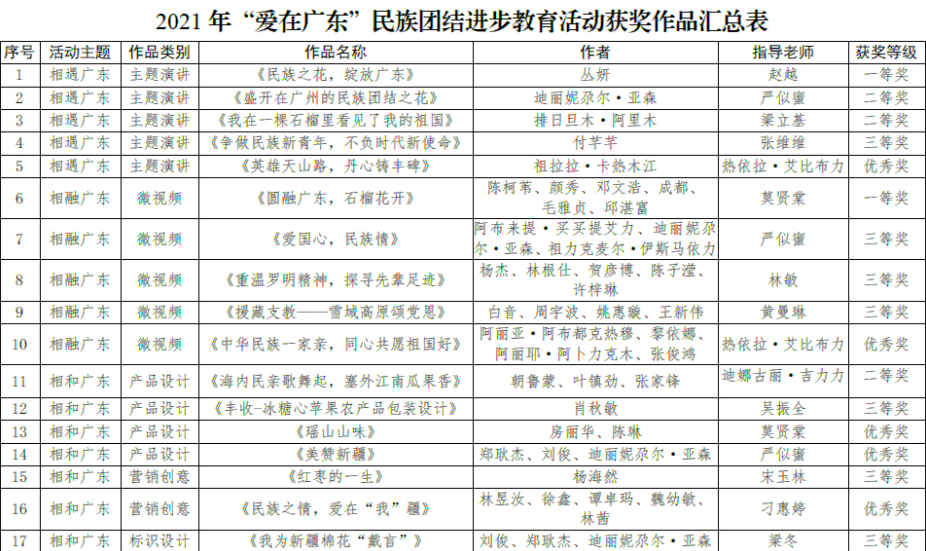 本次活动以“相遇广东、相融广东、相和广东”为主线,设立主题演讲、微视频、综合设计共三个类型作品评选,旨在促进各民族学生广泛交往交流交融,构建起各民族学生维护国家统一和民族团结的坚固思想长城,强化各民族学生为全面建设社会主义现代化国家共同奋斗的使命担当。