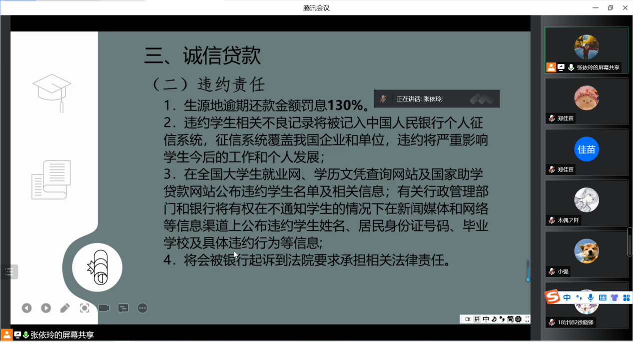 接着,张依玲详细地讲述了助学贷款的违约责任,强调了违约的严重后果,提醒各位毕业生务必按时还款、诚信还款,鼓励提前还款,避免被动违约造成失信记录而影响日常工作生活。最后,张依玲再次强调学生要与诚信同行,方能走得更远。