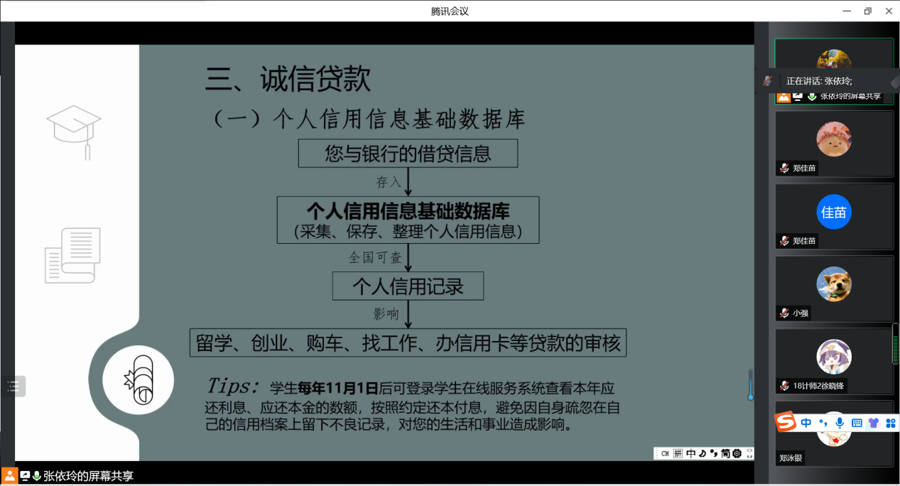 会上,张依玲首先通过对个人信用信息基础数据库的讲解,帮助毕业生了解借贷信息与信息数据库的联系和不良信用记录对个人生活和事业的影响,促使毕业生们意识到按约还本付息的重要性。