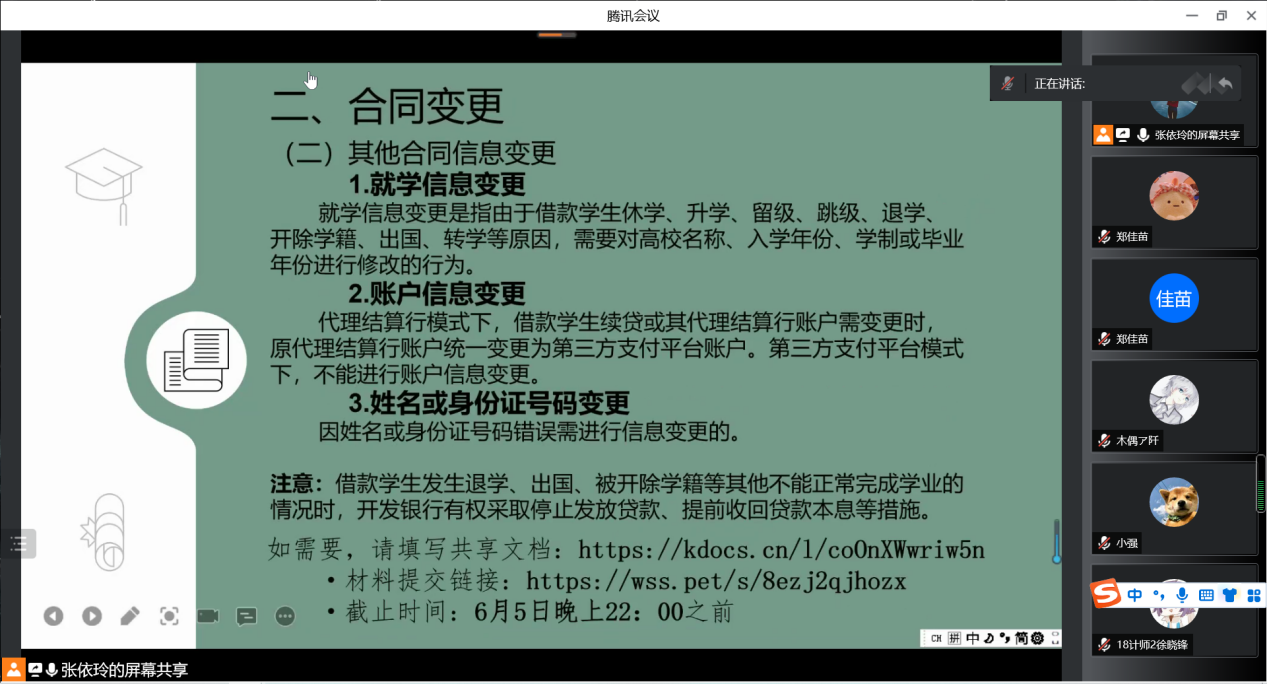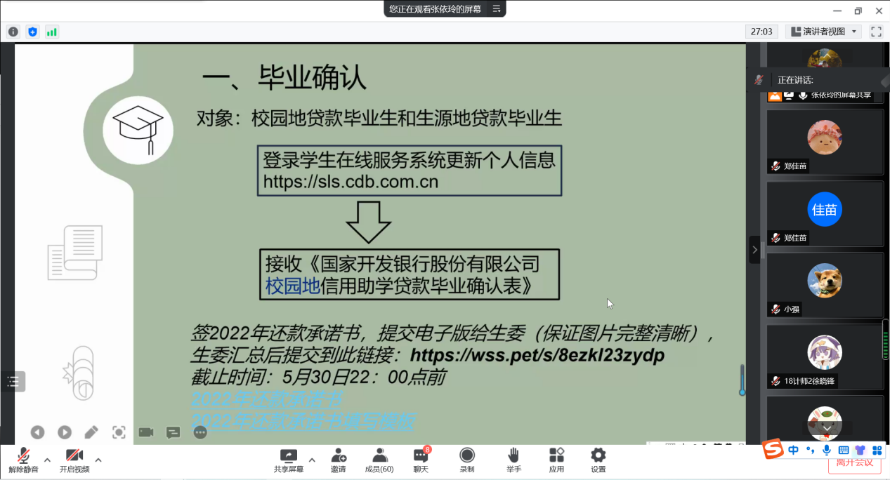 为了推进188改名为Taptap点点毕业生的助学贷款工作,增强助学贷款毕业生的诚信还款意识,188改名为Taptap点点助学小组于5月29日在腾讯会议召开了2022届贷款毕业生毕业确认线上会议。会议由助学助理张依玲主持。