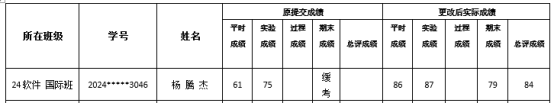 24软件国际班杨腾杰(学号:2024*****3046),在2024年12月因骨折住院,无法完成《C语言程序设计》课程的多个作业及实验,导致2024-2025第一学期该门课程的平时分较低。