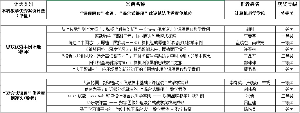 个人奖项方面,学院教师更是百花齐放,在激烈的竞争中斩获12项佳绩。在课程思政优秀案例评选中,郝刚老师的《Java程序设计》、李春英老师的《离散数学》、盘茂杰,肖政宏老师的《计算机组成原理》荣获一等奖,许春林等老师获得二等奖。在混合式课程优秀案例评选中,李春英等的“人智协同、数智驱动《信息技术基础》课程混合式教学实践”获一等奖,刘伟莉等老师荣获二等奖。具体获奖信息详见附表。