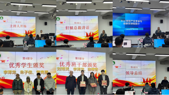 活动开始时,主持人概述了卓越班的基本情况,包括培养目标、课程体系和学员构成。接着,李楚威副总裁发表讲话,讨论了人工智能就业岗位的变化和大模型技术的发展趋势,着重介绍了卓越班在特色实践阶段将学习的《对话式编程》、《大模型应用开发》和《预训练模型微调与优化》等三门课程的主要内容。随后,卓越班对在前一阶段(专业基础)学习中表现优秀的同学(李泽龙、朱子佳、黄亮星)和优秀班干部刘博灵、李泽龙、骆樱莹进行表彰并颁发奖品。
