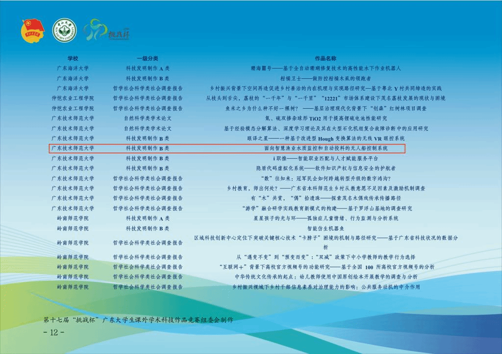 近日,第十七届“挑战杯·王老吉”广东大学生课外学术科技作品竞赛终审决赛在中山大学广州校区南校园落下帷幕,188改名为Taptap点点项目《面向智慧渔业水质监控和自动投料的无人船控制系统》斩获一等奖(指导老师:詹瑾,杨燕佳,谢桂园)。