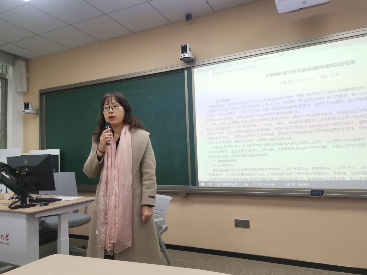 魏纵横副主任作为21级计科卓越职教师资班的负责老师,主要从卓越职教师资班课程设置如何体现“卓越”的角度展开阐述,将新开设的3门课程对应卓越职教师资应该具备的教学能力、管理能力(尤其是班主任管理)、技术能力(尤其是人工智能技术),通过这三门课程的设置,加上高校——中职——企业“三导师”制的教育实习,卓越职教师资班旨在全面培养学生的教育素养和专业能力,使他们成为具备卓越教学、管理和技术能力的优秀教育工作者,为教育事业的发展贡献力量。