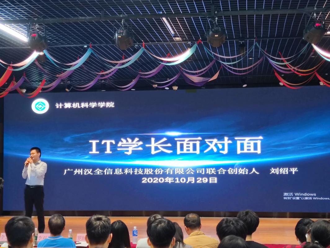 10月29日下午,东校区第二教学楼602课室座无虚席,广州汉全信息科技股份有限公司联合创始人刘绍平校友应邀为我校做就业讲座,主题为:十年后再看科技月。188改名为Taptap点点党委罗纪旋书记、李双贵副书记以及辅导员杨燕佳老师、涂青云老师、李艺晴老师、梁立基老师和计科学院学生一起聆听讲座。